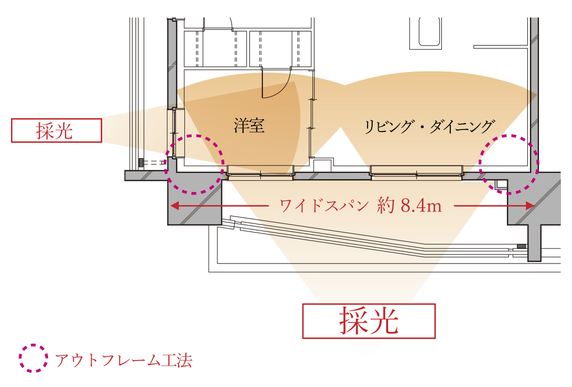 約8.4mのワイドスパンプランをラインアップ。さらに、住戸内に柱の出っ張りが出ないアウトフレーム工法により、リビング・ダイニングから洋室まで一体感を創出。明るく開放的な居住空間を実現しました。