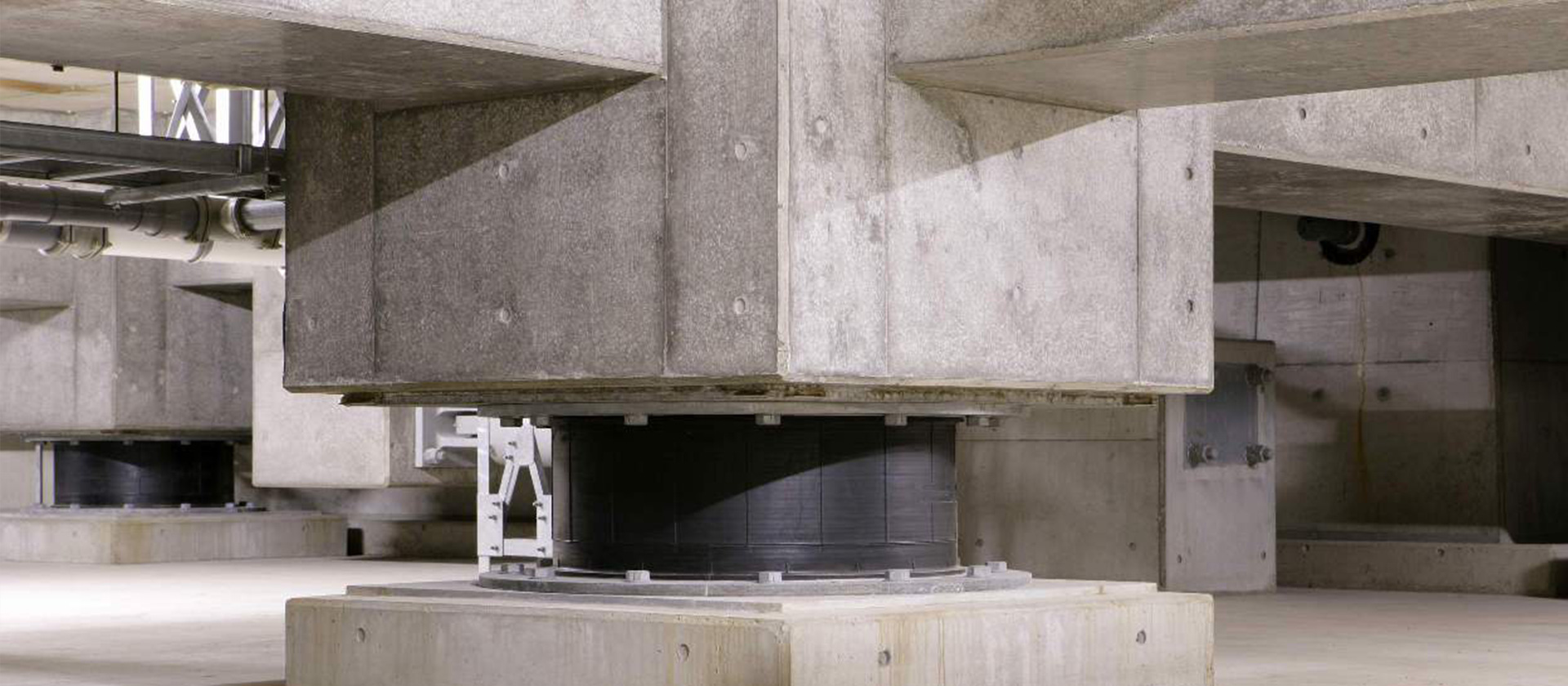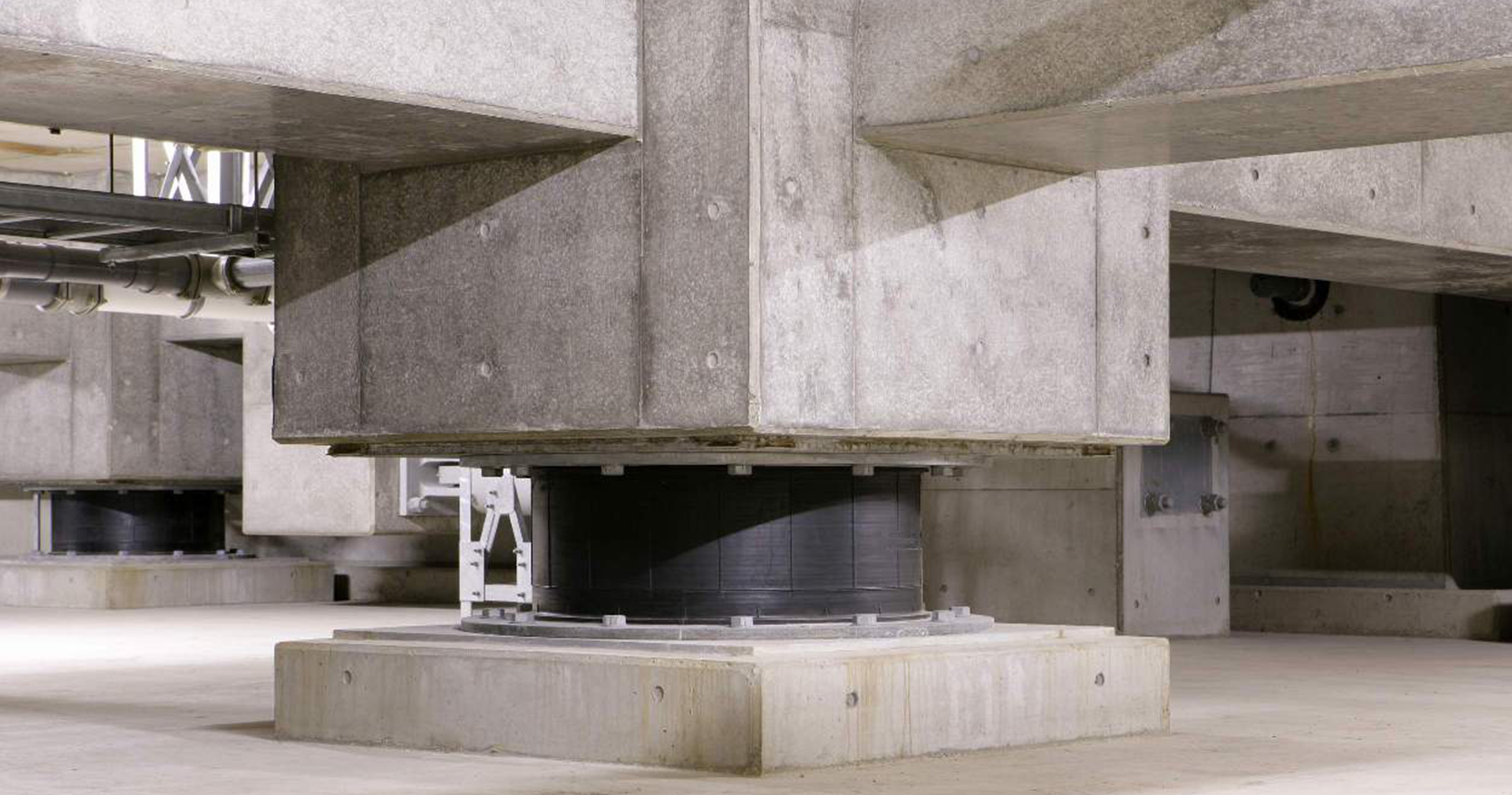 免震装置と呼ばれる特殊な緩衝材を組み込むことで、